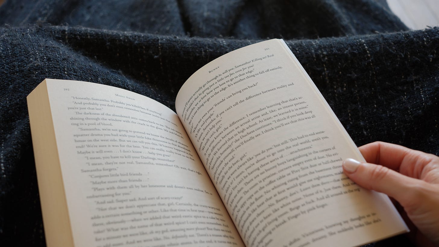 My plan from here was to swing back to nonfiction and start Braiding Sweetgrass by Robin Wall Kimmerer for The Stacks book club later this month, but I caught a wild hare (heh) and instead went for another novel, Bunny by Mona Awad. Though it’s been on my shelf a while, it’s newly enticing because the follow-up, We Love You, Bunny, comes out next month.7 The main character, Samantha, is a student in a fancy New England MFA program, an outsider in her all-female cohort of five. Where she’s moody, pensive, a bit of a loner, the others are bubbly and outgoing and all call each other “Bunny.” I went into the story not knowing much more than that, and I’d recommend doing the same—what follows is not easily described anyway, so it’s probably better to simply suspend disbelief, sink into it, and find out for yourself. I’ll just say: prepare for a bit of magic and a heavy dose of dreamlike darkness. Definitely a “wait, what?” reading experience, but exactly what I wanted with autumn hovering on the horizon, and yes, I absolutely plan to read the new one as soon as I can obtain a copy.